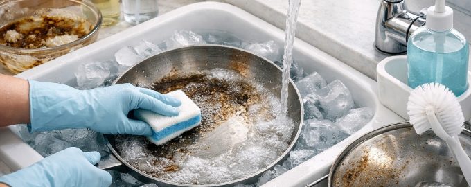 Το κύριο μυστικό της επιτυχίας στο κρύο νερό δεν έγκειται στην ένταση της τριβής, αλλά στη σωστή προετοιμασία. Αν τοποθετήσετε αμέσως ένα λιπαρό τηγάνι κάτω από ρεύμα παγωμένου νερού, το λίπος θα στερεοποιηθεί αμέσως, σχηματίζοντας ένα παχύ φιλμ.