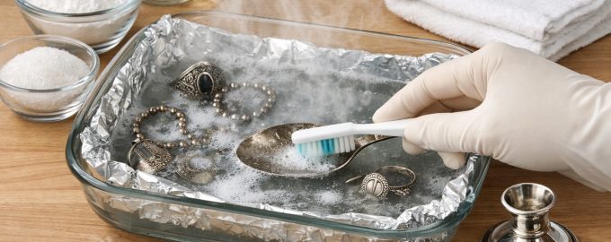 Σόδα και αλουμινόχαρτο. Αυτή είναι μια από τις πιο αποτελεσματικές χημικές μεθόδους. Ένα φύλλο αλουμινόχαρτου τοποθετείται στον πυθμένα του δοχείου, το κόσμημα τοποθετείται από πάνω και καλύπτεται με μαγειρική σόδα. Αφού ρίξετε βραστό νερό, λαμβάνει χώρα μια αντίδραση που μεταφέρει κυριολεκτικά την πλάκα από το ασήμι στο αλουμινόχαρτο.