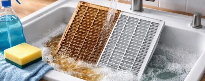 Το κύριο μυστικό για τον γρήγορο καθαρισμό δεν είναι να ξύσετε μηχανικά τη βρωμιά “στεγνά”. Αυτό θα χαράξει μόνο το πλαστικό και θα σπρώξει τη σκόνη βαθύτερα στις ρωγμές. Αφαιρέστε τη γρίλια και τοποθετήστε την σε ένα μπολ με νερό. ζεστό νερό. Η θερμοκρασία πρέπει να είναι υψηλή, αλλά όχι βραστό νερό, ώστε να μην παραμορφώνεται το πλαστικό. Προσθέστε μια γενναιόδωρη ποσότητα στο νερό τζελ πλυντηρίου πιάτωντο οποίο είναι εξαιρετικό στο σπάσιμο της λιπαρής μεμβράνης. Αφήστε τη σχάρα να μουλιάσει για τουλάχιστον 15-20 λεπτά.