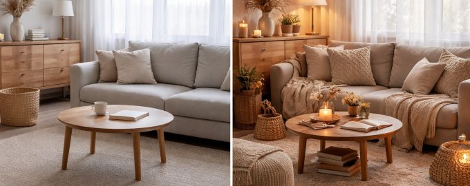 Αν δεν έχετε τη δυνατότητα να τα καταχωνιάσετε όλα πίσω από κλειστές πόρτες, χρησιμοποιήστε ένα εσωτερικά καλάθια και κουτιά. Βοηθούν στην ομαδοποίηση μικρών πραγμάτων. Ένα αισθητικά ευχάριστο κουτί σε ένα ράφι φαίνεται πολύ πιο τακτοποιημένο από δέκα διάσπαρτα αντικείμενα. Επιλέξτε οργανωτές από φυσικά υλικά ή πλαστικό σε ήρεμους τόνους, ώστε να εναρμονίζονται με το περιβάλλον.