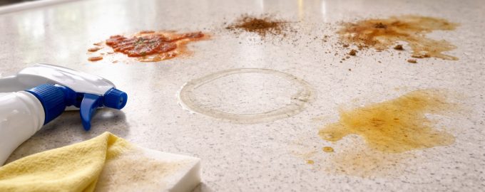 Αυτό είναι ιδιαίτερα αισθητό σε σκούρες πέτρινες ή γυάλινες επιφάνειες εργασίας. Για να αποφύγετε αυτό το πρόβλημα, μετά τον υγρό καθαρισμό η επιφάνεια θα πρέπει να σκουπιστεί αμέσως με μια μαλακή πετσέτα ή χαρτί κουζίνας. Αυτό θα αποτρέψει τη φυσική εξάτμιση της υγρασίας και το σχηματισμό ορυκτών αποθέσεων.