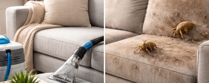 Βαθιά μέσα στις ίνες του υφάσματος και το υλικό πλήρωσης, δημιουργούνται ιδανικές συνθήκες διαβίωσης ακάρεα της σκόνης. Τρέφονται με τα νεκρά σωματίδια του ανθρώπινου δέρματος που αναπόφευκτα καταλήγουν στα έπιπλα. Οι ίδιοι οι μικροοργανισμοί δεν δαγκώνουν, αλλά τα προϊόντα τους αποτελούν ισχυρό αλλεργιογόνο. Το τακτικό σκούπισμα με ηλεκτρική σκούπα τους στερεί το έδαφος αναπαραγωγής τους και μειώνει σημαντικά τον πληθυσμό τους.