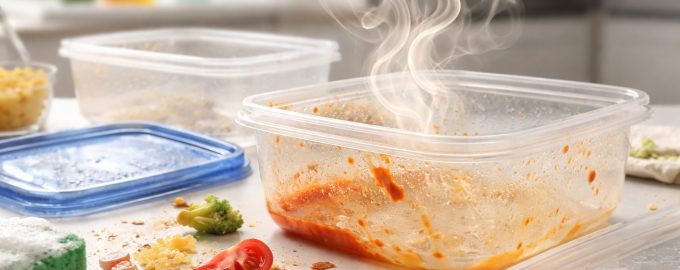 . Η χρήση σκληρών σφουγγαριών και λειαντικών σκονών καθαρισμού δημιουργεί ένα δίκτυο μικρο-γρατζουνιών στο πλαστικό. Η χρήση σκληρών σφουγγαριών και λειαντικών σκονών καθαρισμού δημιουργεί ένα δίκτυο μικρογρατζουνιών στο πλαστικό. βακτήριατα οποία μπορούν να προκαλέσουν μια δυσάρεστη οσμή αποσύνθεσης. Όσο παλαιότερο είναι το δοχείο, τόσο πιο δύσκολο είναι να καθαριστεί σε άριστη κατάσταση λόγω της φθοράς της επιφάνειας.Ένας άλλος κρίσιμος παράγοντας θέρμανση. Όταν ζεσταίνετε τα τρόφιμα στο φούρνο μικροκυμάτων απευθείας στο δοχείο, οι πόροι του πλαστικού διαστέλλονται όταν εκτίθενται στη θερμοκρασία. Αυτό επιτρέπει στα σωματίδια των τροφίμων να διεισδύσουν ακόμη βαθύτερα στη δομή του υλικού. Όταν κρυώσει, οι πόροι συρρικνώνονται, “κλειδώνοντας” την οσμή στο εσωτερικό, απ’ όπου είναι σχεδόν αδύνατο να ξεπλυθεί με κοινό νερό.